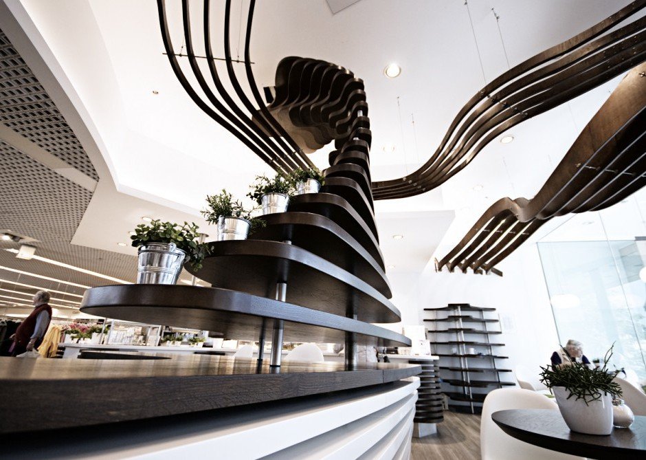Me gusta mucho el diseño de este restaurante. Su superficie de más de 100 metros cuadrados nos muestra una serie de composiciones de curvas complejas que combinan a la perfección con el sofisticado mobiliario. Además me gusta la elección que se ha hecho de cada uno de los elementos. Todos armonizan entre sí y a la vez armonizan con la espectacular estructura central que es la que acapara las miradas.