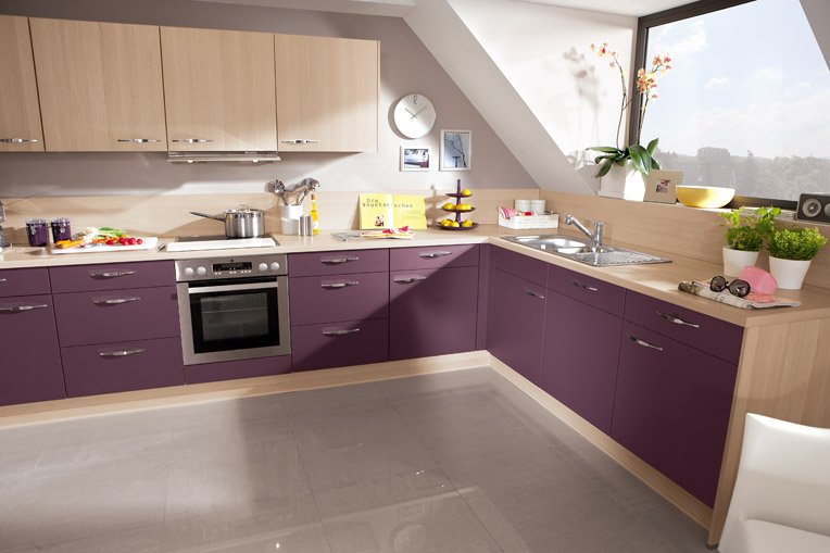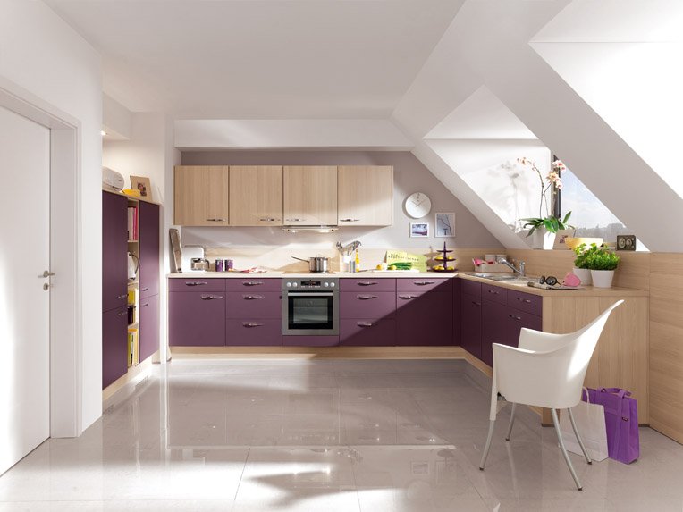 Cocina Speed 240. La alegre combinación de fresno y el color baya de sus frentes le darán un ambiente agradable a tu cocina. Esta cocina es ideal para espacios de techos reducidos ya que la mayor parte del mobiliario es bajo.