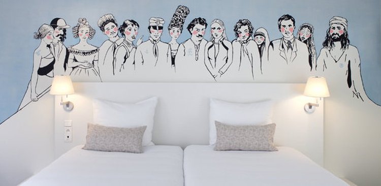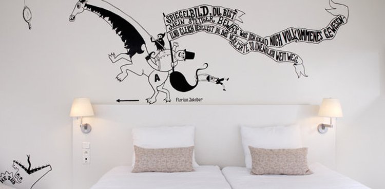 Pero esto es una página de decoración así que vamos a comentar un poco cómo son las habitaciones que es ahí donde reside la originalidad de este hotel. La base de todas las habitaciones es la misma: el blanco. Pero lo que hace que cada una sea única y personal es que jóvenes artistas europeos han plasmado en ellas su propio estilo con fenomenales frescos.