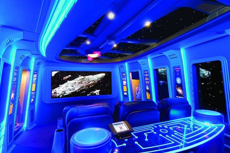 El cine está situado en una sala de 6 x 4 metros y su pantalla es de 107 pulgadas. Cerca de la pantalla tiene dos figuras a tamaño real de R2-D2 y C3PO que hablan. Si te fijas en las imágenes podrás ver la de R2-D2. Tiene 6 asientos y un techo tridimensional con fibra óptica. Para rematar la ambientación la puerta de la sala está automatizada.