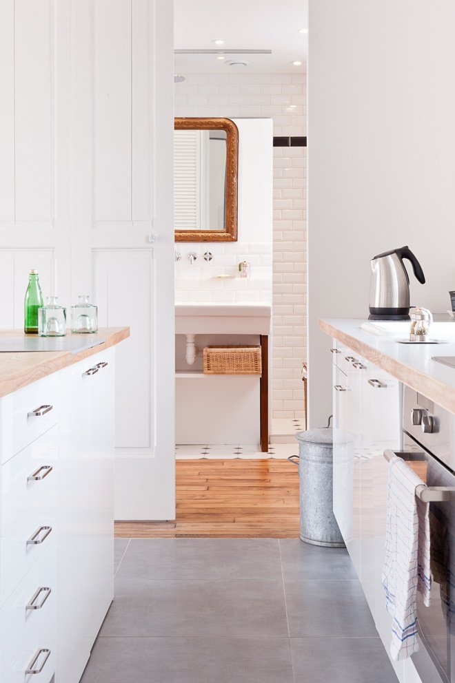 La mucha luz que entra por la ventana se ve acompañada por la decoración basada principalmente en el blanco, dejándonos un espacio que rebosa iluminación natural. Otra característica que destaca en este loft es el toque natural (incluso algo rústico) que se ha buscado en el ambiente. Como verás en las fotos hay mucho mobiliario de madera, accesorios de mimbre, tonos crudos, etc. Incluso el parquet es de madera de roble.