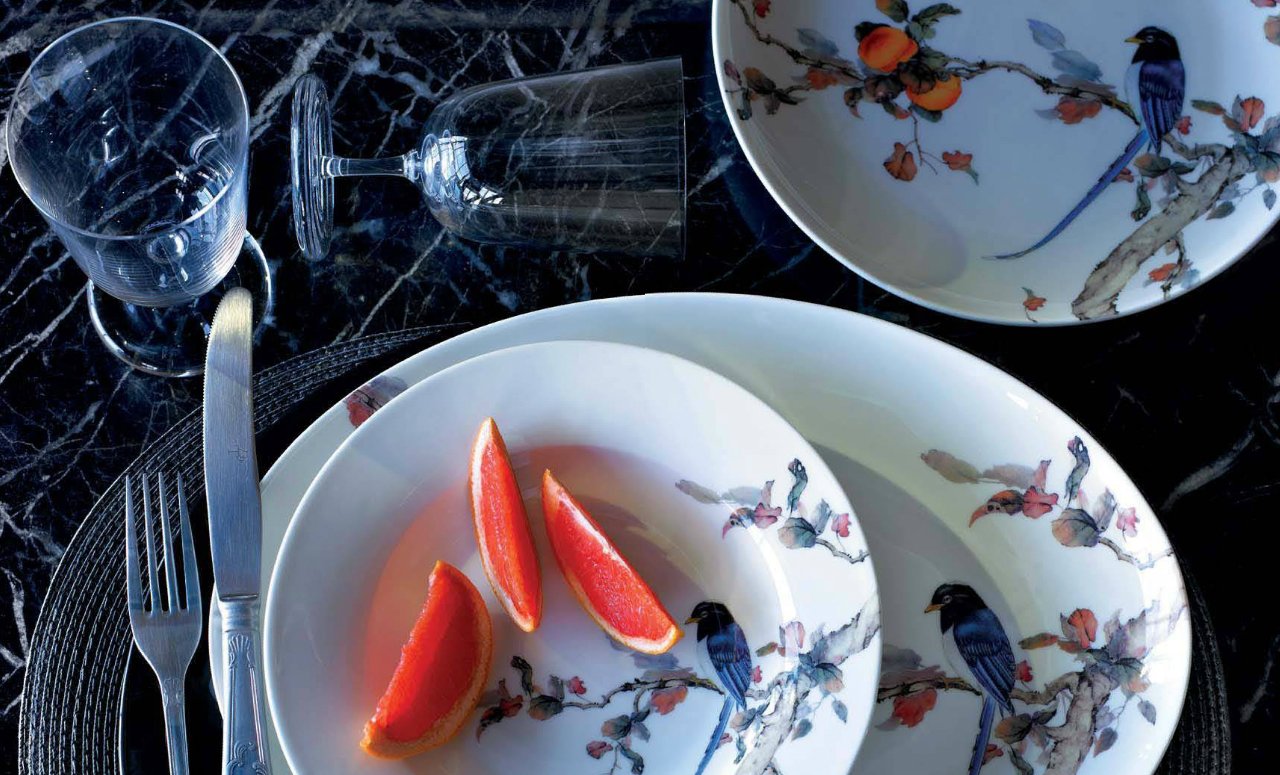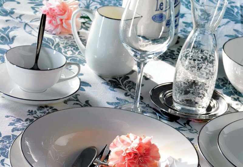 Esta elegante imagen está compuesta por elementos de varias firmas. Tanto los platos hondos y llanos, como la fuente ovalada, pertenecen a la colección Volvoreta de Santa Clara. Cada una de las unidades de platos tiene un precio de 4,90 euros, mientras que la fuente la puedes adquirir por 25 euros.