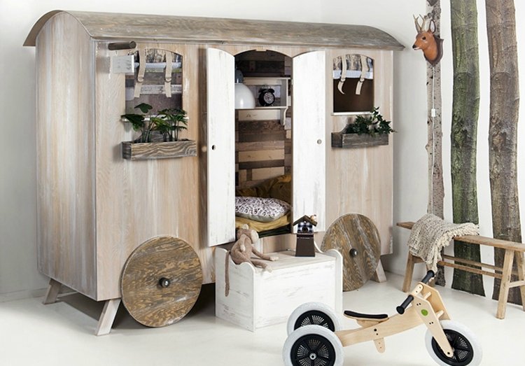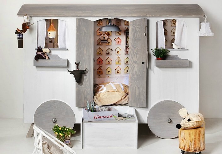 Habitación Pipowagen, o cómo dormir en una roulotte dentro de tu propia casa. He querido empezar por esta habitación porque es la que más me ha llamado la atención de todas. Dormir en esta cama debe ser una aventura en sí, no es necesario imaginarse ninguna fantasía más. Como verás en las imágenes, tienes más de un diseño de caravana para elegir. Sus dimensiones son 250 x 150 x 198 cm. Puedes ver más información aquí.