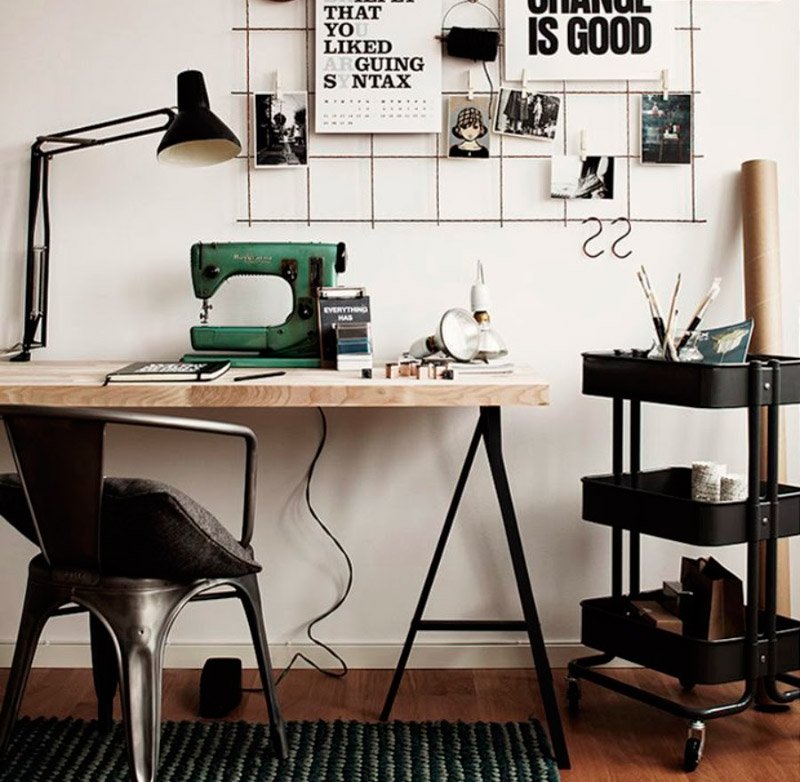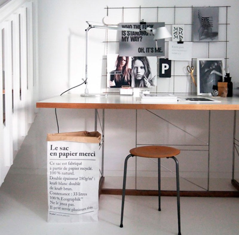Este es un diseño en el que se crea un espacio para el trabajo creativo y artístico. Los cajones con ruedas permiten organizar las herramientas de trabajo y trasladarlas de lugar si es necesario. Sobre la pared y en frente de la mesa de trabajo, se ha colocado una sencilla armazón de metal en la cual se cuelgan los bocetos y fotografías que sirven de inspiración. La lámpara de pellizco es la que proporciona la luz artificial que incide directamente sobre la zona de trabajo.
