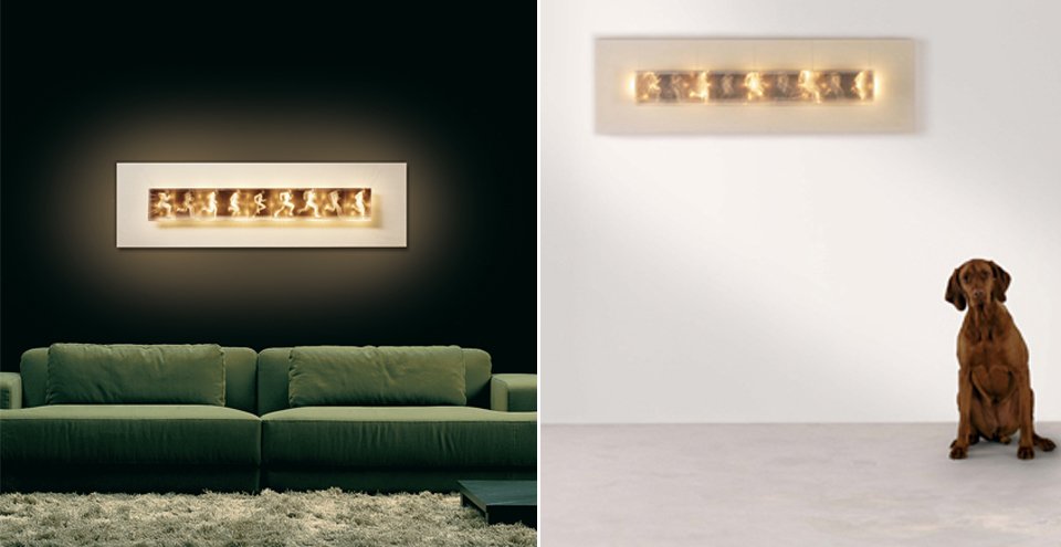 La iluminación libera la imagen, y es capaz de reforzar estas imágenes del precursor del cine. Esta combinación de luces y movimiento está enmarcada en un marco de madera recubierta. Tiene unas dimensiones de 120 x 35 cm.