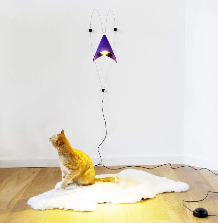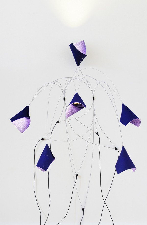 Gracias a los cables de acero que presenta la lámpara podemos mover el punto de luz libremente en cualquier dirección. Estos cables acaban en un precioso foco muy luminoso con una iluminación LED de 3W. En las imágenes solo te he presentado focos de color purpura, pero en la web del estudio Toer podrás elegir entre más de 10 colores.