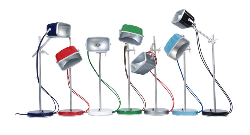 Cada una de estas originales lámparas está realizada en aluminio y policarbonato, y puedes elegir entre 7 colores diferentes: negro, azul oscuro, rojo, blanco, azul celeste, gris y verde. Las lámparas cuentan con un brazo ajustable para orientar la luz. Esta colección es ideal para completar una decoración retro.