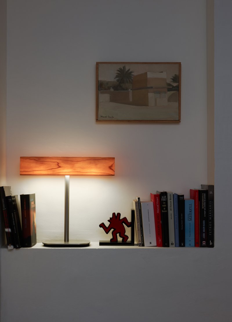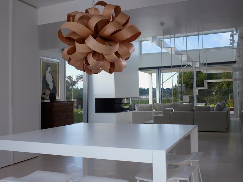 El perfecto acabado de cada una de sus lámparas se debe a la perfecta combinación de éstas dos premisas: el trabajo artesanal y el uso de chapa de madera. Este material noble confiere un efecto espectacular a la iluminación, proyectando la belleza interna de la madera e irradiando una delicada calidez que embellece la atmósfera.