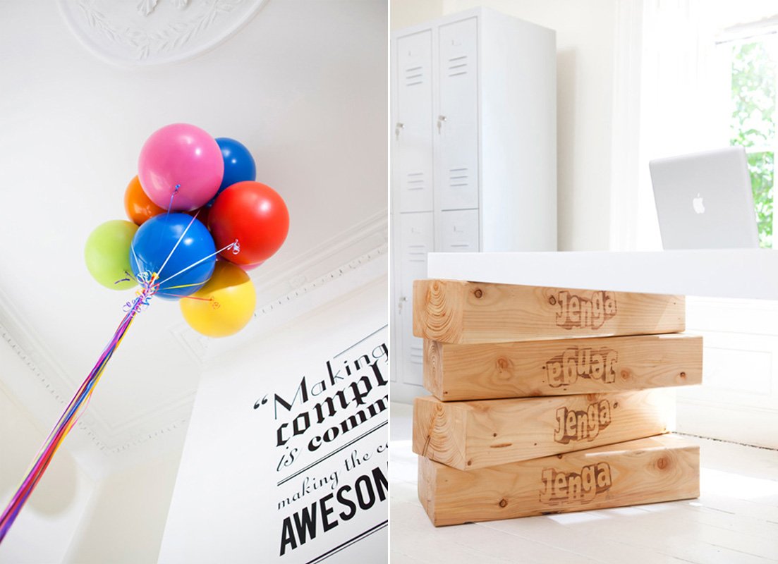 El estudio creativo Boys and Girls con sede en Dublín ha creado este fantástico escritorio llamado Hot Desk. Brillante, innovador, creativo, divertido, transgresor, etc. Los calificativos se me acaban para calificar esta creación. El escritorio se apoya por un lado en un montón de bloques de madera del juego Jenga y por el otro en un montón de globos de colores.