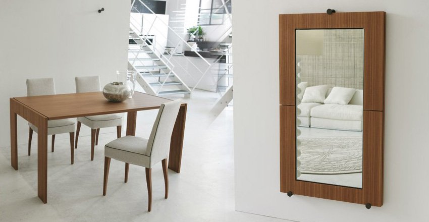 Anteriormente os presenté una mesa muy funcional que podía convertirse de mesa baja a mesa alta. Pero si hablamos de funcionalidad y de versátilidad, la mesa que te voy a presentar ahora se lleva la palma. Esta Mesa-Espejo Tip Over es, como su propio nombre inidica, un espejo de pared que se transformará en mesa gracias a un innovador sistema patentado.