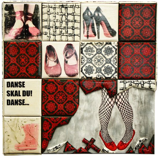 Como ya os comentaba anteriormente, las decoraciones de estos azulejos no son del todo convencionales. Cráneos, tacones de aguja, muñecas, dedos, palabras, etc., todo ello en colores blancos y negros, y rematados con destellos de color provocativos.