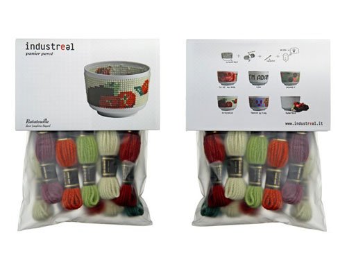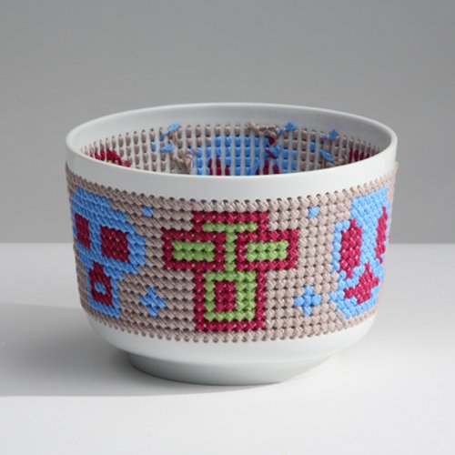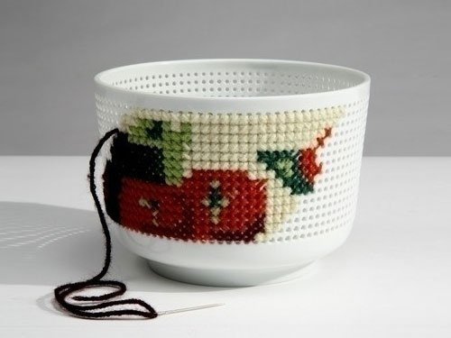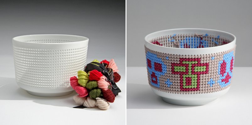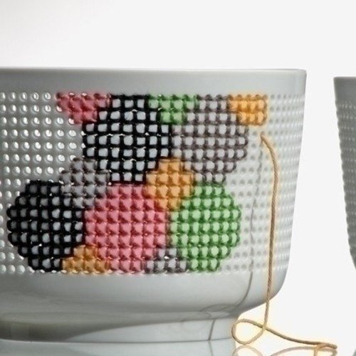 La colección se llama Panier Percé (cesta agujereada) y son una especie de bols de porcelana con sus lados agujereados. Cada uno de ellos viene acompañado de un kit de costura compuesto de hilos de colores, una aguja y diferentes patrones para ofrecernos inspiración.