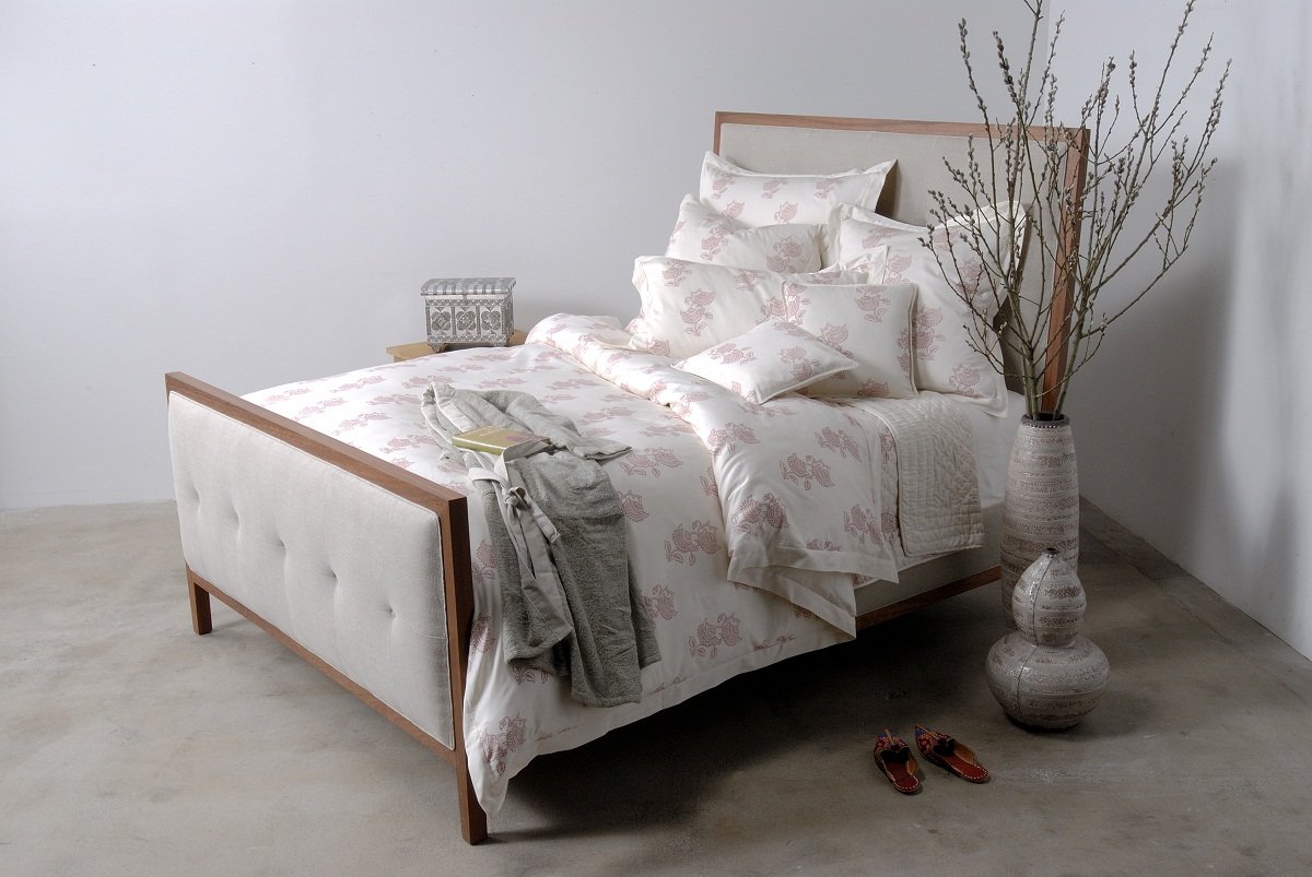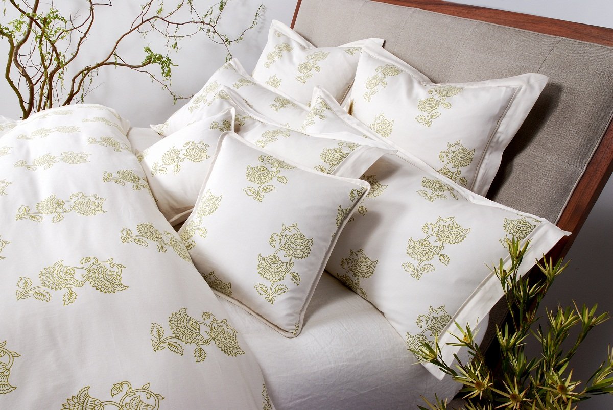 Los motivos indios de la ropa de cama presentan un diseño muy fino y trabajado. Éstos están impresos en satén de algodón orgánico de alta calidad. Los tejidos son cortados y cosidos a mano por mujeres de Jaipur, India.