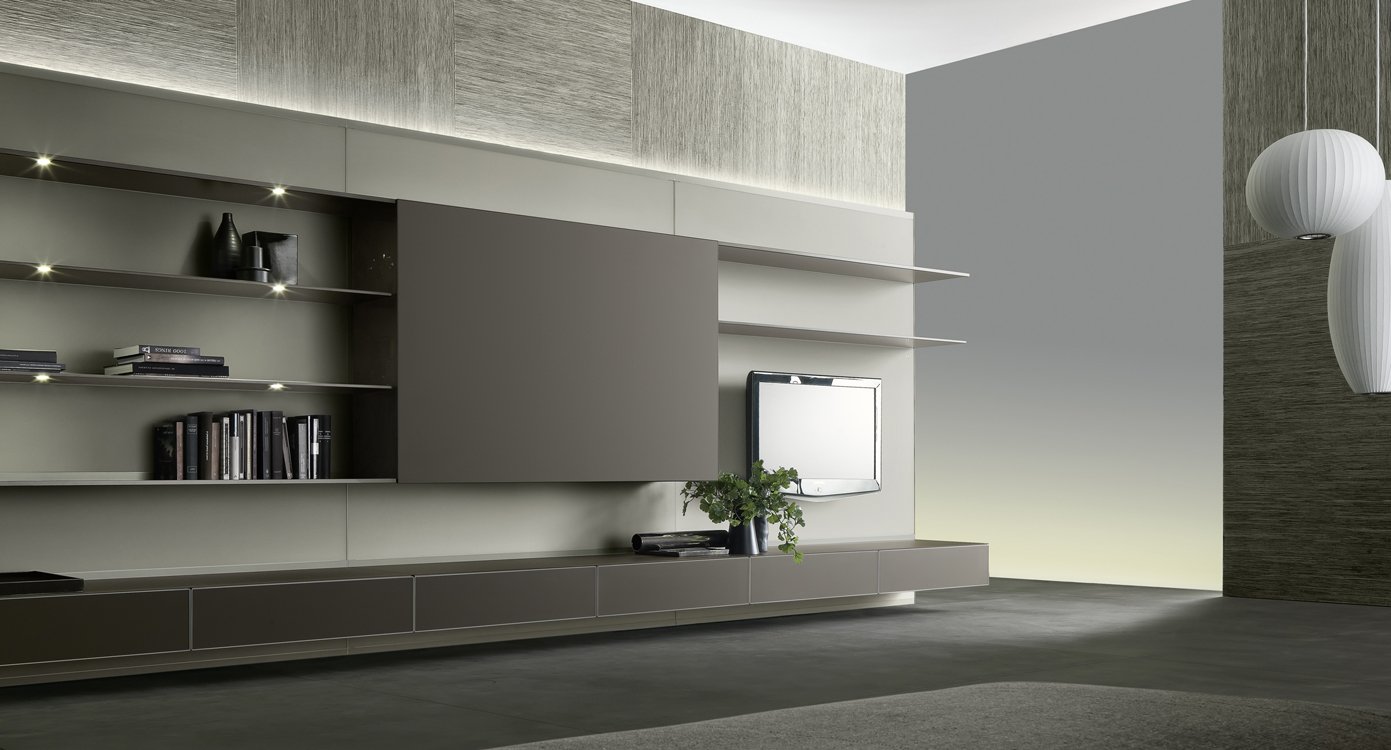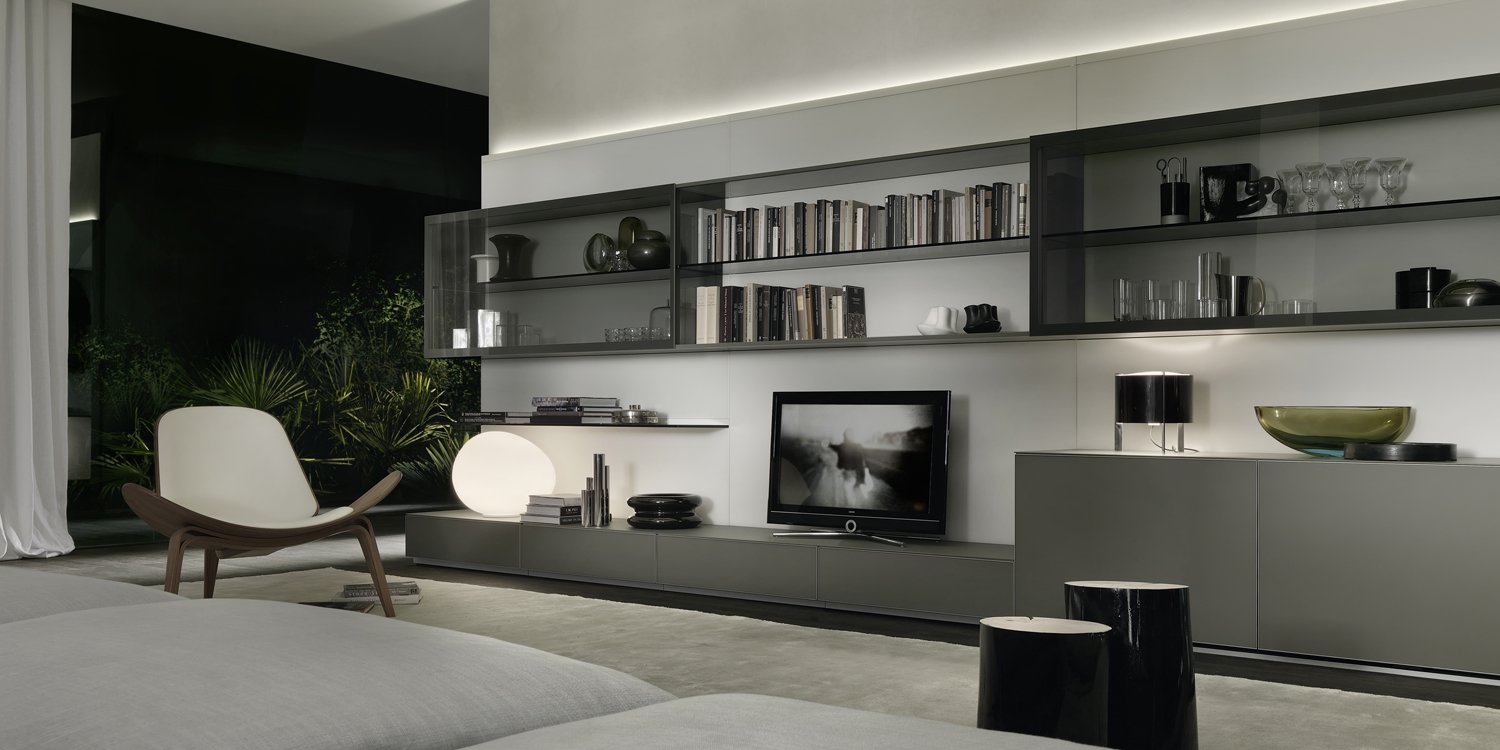 La boiserie Abacus Living presenta una amplia variedad de accesorios (estantes, contenedores, bancadas, elementos para la televisión que nos permitirán ocultar cables, etc.) que nos permitirán resolver cualquier necesidad estética que se nos plantee. Todos estos elementos se instalarán muy fácilmente gracias al patentado sistema de fijación invisible de Rimadesio, que no deja ver los elementos de sujeción.